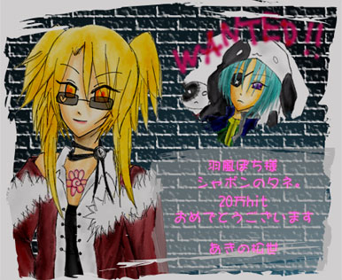 あきの松世さんに20万ヒットお祝いを頂いてしまいました/// こんなサイトの為にわざわざありがとうございますっ(感涙) | ||